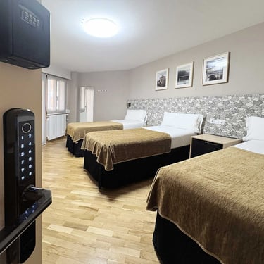 En Pensión Laurel disfrutarás de habitaciones acogedoras con baño privado, diseñadas para ofrecer el máximo descanso, equipadas con WiFi gratuito, aire acondicionado y calefacción para tu confort durante todo el año. Nuestro sistema de auto check-in con cerraduras digitales sin llave te permite llegar a tu ritmo, sin esperas ni horarios, con total seguridad. Además, cuidamos cada detalle con una limpieza impecable y un mantenimiento constante, todo en una ubicación privilegiada en pleno corazón gastronómico de Logroño, ideal para vivir la ciudad al mejor precio.